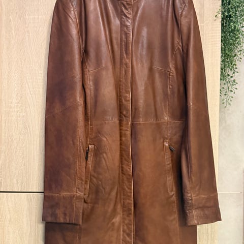 Nydelig lang jakke i mykt lammeskinn, foret. Cognac farge. Selges fordi den desverre ikke blir brukt!
