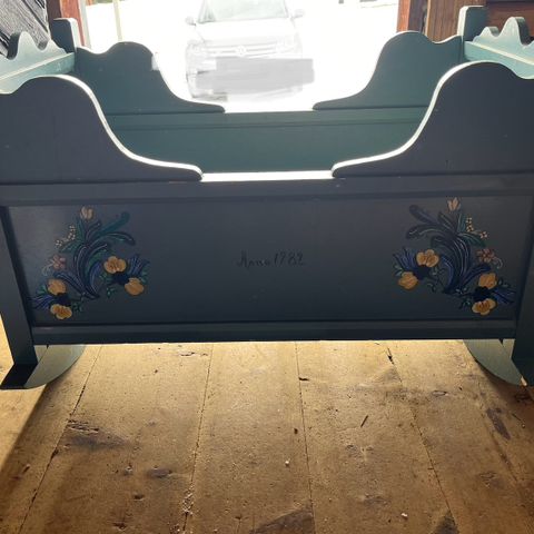Leandervugge med krok for å henge i taket selges. Det medfølger en rosa sengehimmel.
