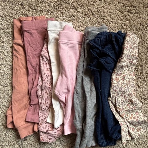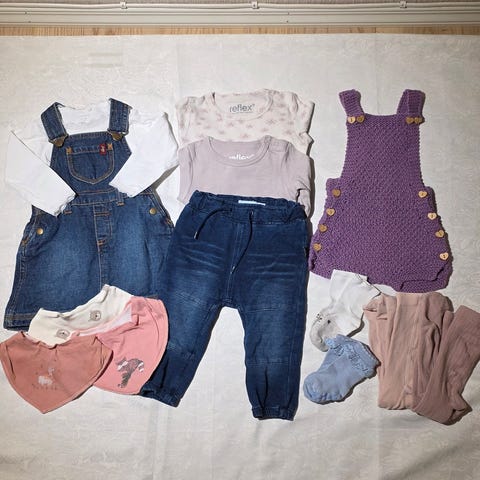 Pent brukt, Langermet sparkebukse, langermet body, olabukse, smekke, strømpebukse, bukse ( alle i størrelse 56) den myke velour genseren er i størrelse 62. Koseklut/leke.