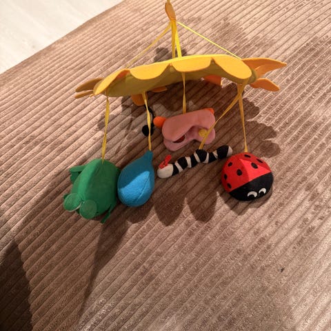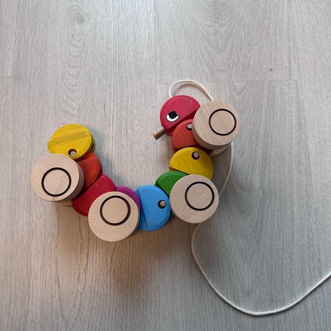 Morsom / Flott leke i tre til små barn. Når den triller roterer blomstene på sidene. God kvalitet.
