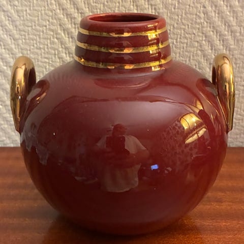 2 fine keramikk vaser i burgunder rødt og med noe gull-maling. God stand.