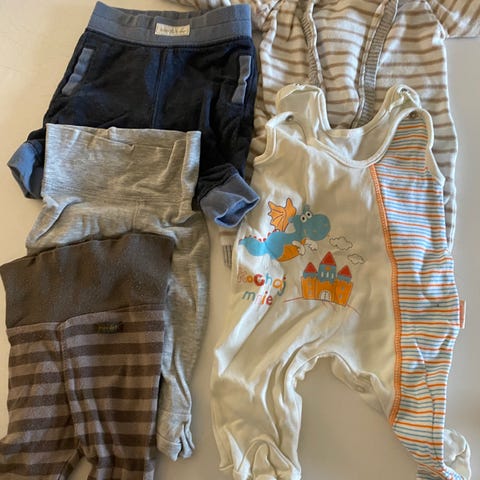 En langermet body, en bukse, smekke, sparkebukse og kort sparkebukse. Samlet kr 150,-