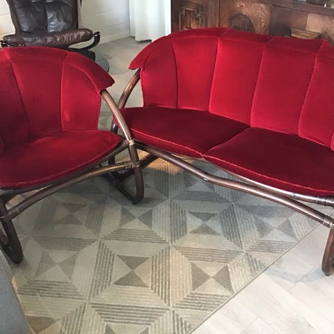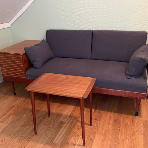 Retro sovesofa med teak på armlener og føtter i brukbar stand. Originalt helt stoff, virker som den skal. Mørk grønn. Blir grundig rengjort før salg.