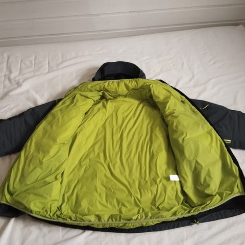 Avtagbar hette, limegrønn detalj bak glidelås.
