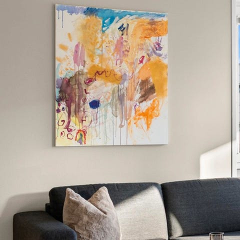 Uåpnet abstrakt maleri, er fortsatt innpakket i plast og med beskyttelse på hjørnene.