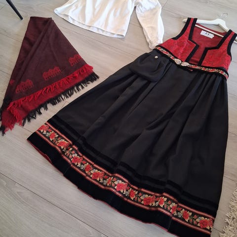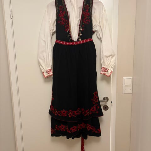 Vestfold bunad str 36/38 Med Vestfoldbunad skjorte og veske. Fra skulder og ned 126 cm. Rundt livet 85 cm. Selges kr 24000