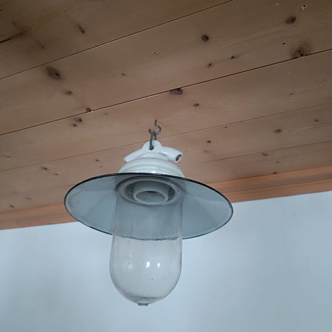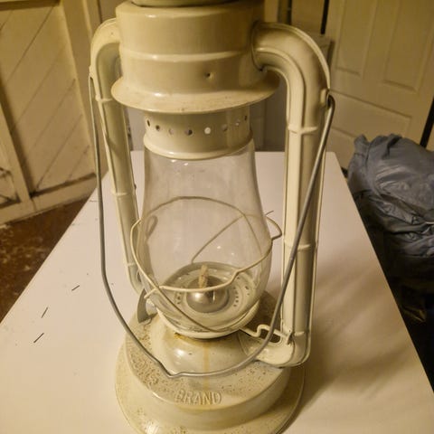 Gammel fjøslykt, ser ut som alt er der utenom veke og olje.