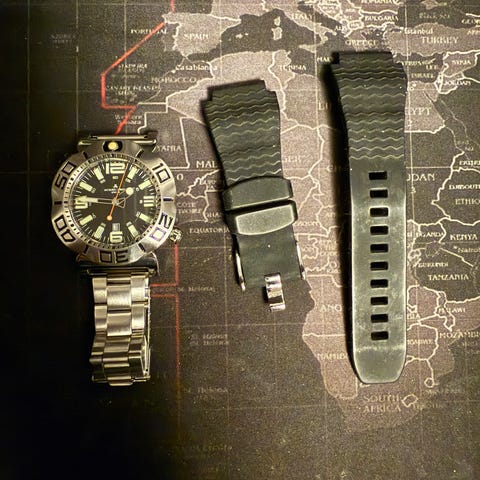 Originalen var en svart stropp, men ble erstattet fra fabrikk med en F-5033G gul stropp (kostet 750Kr). Aldri brukt med ny stropp.