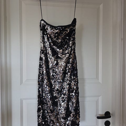 Nydelig kort paljettkjole. Stroppeløs, tettsittende. Aldri brukt. Str S, normal i størrelse.