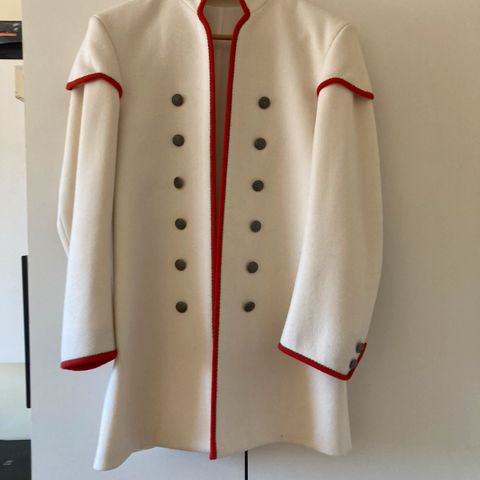 Kan tilpasses noe, armene er per dags dato lagt opp 6 cm og dette kan sprettes opp på få sekunder. Det er stoff nok bak til å øke livvidde flere cm. Skjorta er av strykefri polyester. Beltespenne i sølv.