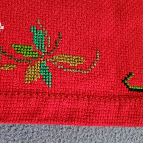 Rød juleduk med broderi av julemotiver som nisser og lys. Duken har scalloped kanter og er laget av bomullsmateriale. Perfekt for å dekke bordet i julen og skape en festlig atmosfære.
