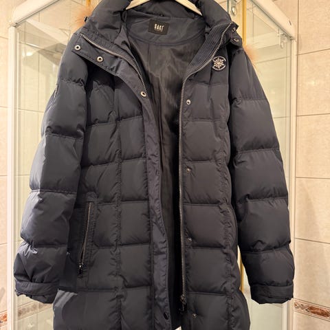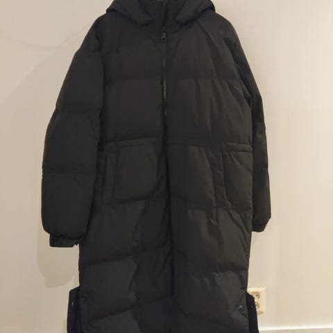 Selger en fin vattert parkas (lang), svart. Fått i gave men er altfor stor . God og varm.