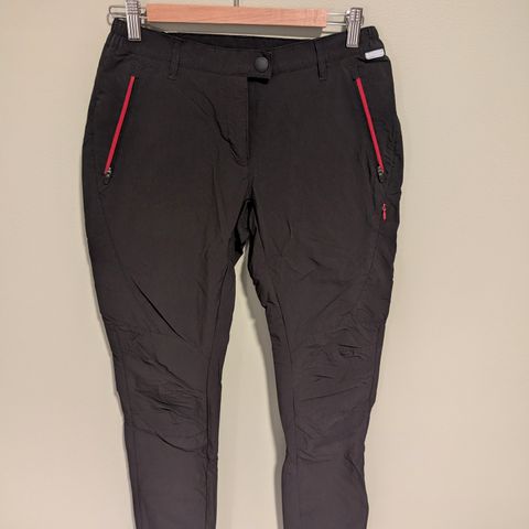 Mørkegrå bukse fra Mirage i modellen Super Cotton. Størrelse 38-livvidde er 80 cm, skrittlengde 24 cm og indre benlengde 79 cm (hel lengde er 103 cm. Lommer foran med glidelåslukking, formsydde detaljer ved knærne. Laget av en blanding av bomull, polyamid og elastan, god stretch i stoffet. Pent og lite brukt uten flekker eller skader.