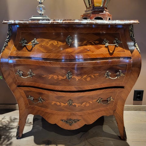 Fra ca 1940/50-tall med marmortopp. Skuffer og alt fungerer og nøkkel er også med.