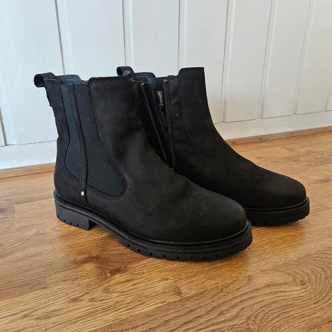 Sorte snøreboots i mykt sort skinn. Kun brukt en gang for å prøve dem, ingen bruksmerker. Selges da de ikke passet godt. Ny pris 1600kr.