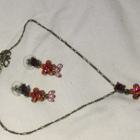 Pent og helt smykkesett. Lengde halssmykke 154 cm. Tilhørende ørepynt.