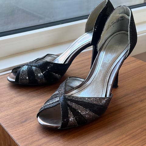 Coole og pene lekkre juicey couture pensko med høy feet hel med glimmer. De er i St 38, sorte med gull såle. åpen tå og med lukke lås over vristen for bedre komfort. Super lekre med i sort lakking glimmer med såleri gull med skriften og i selve sålen!