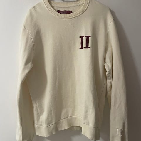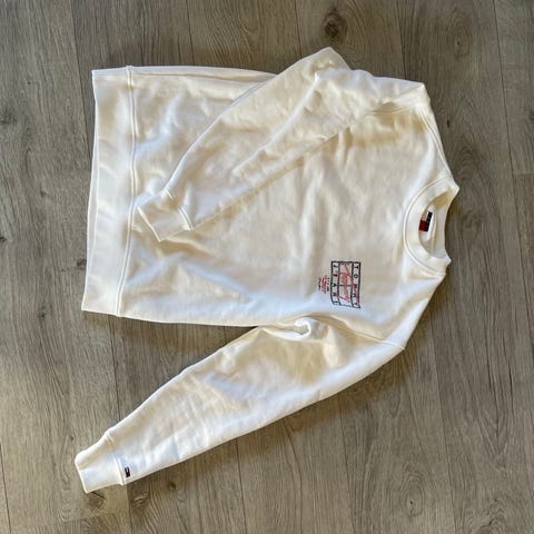 En collegegenser, merke Polo, str M, men stor modell, farge off-white med litt brukt og svakt rødt på symbolet på brystet.