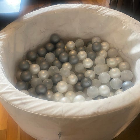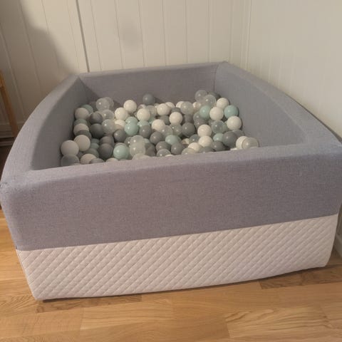 Søt ballbinge med et ekstra sett baller(fordi disse bingene selges med ganske få baller). Bingen er deformert etter vask og slitt i trekket. Men med alle ballene oppi gjør det ikke noe, Masse masse bruk igjen, høyt elsket her. Selges pga plassmangel.