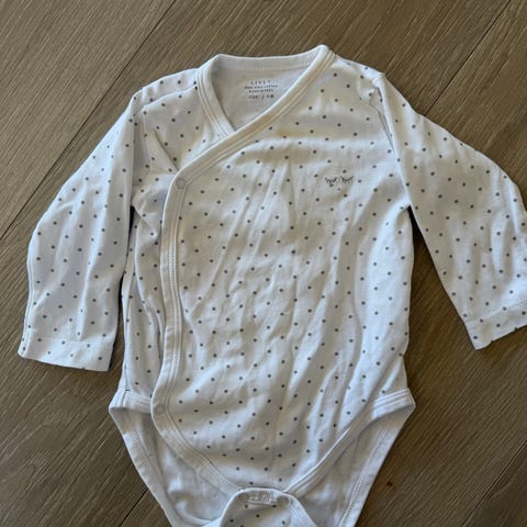 Body fra Name It i str. 68. Hvit bunnfarge og mørk beige/grå og blå detaljer. 95 % økologisk bomull og 5 % elastan. Jeg opplever Name It som stor i størrelsen. Brukt og vasket få ganger.