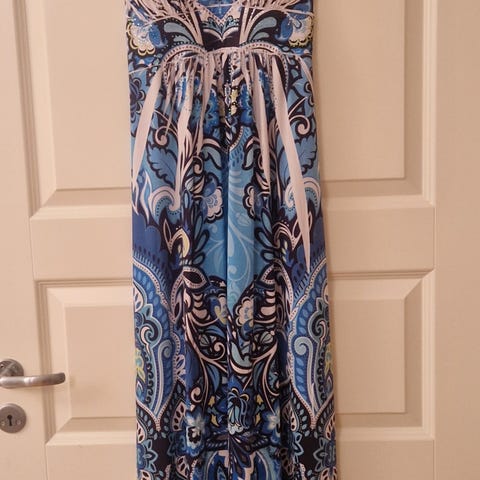 Nydelig Michael Kors kjole i en skjønn blå farve med splitt på venstre side.Stoffet er tungt så kjolen faller nydelig på kroppen .Str L og brukt en gang .Hbo 400.- + porto 69,-
