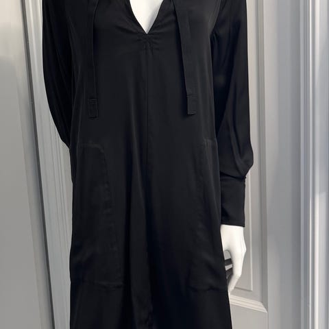 Pent brukt dongerikjole i str 38 (normal i størrelsen). Mørk blå nesten svart kjole i tjukk dongeri og noe skinnimitasjon langs magen. Nypris kr 1 899.