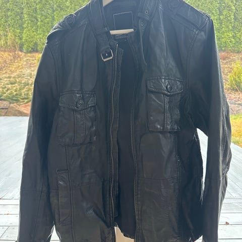 Tykk foret brun skinnjakke og lyseblå skjorte selges