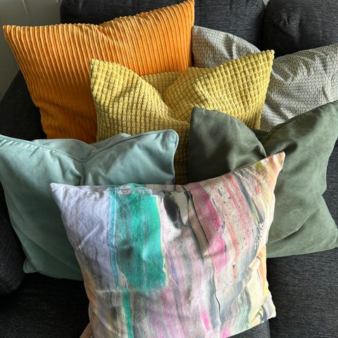 2 design putetrekk i ulike gråfarger, svart og hvitt. Camilla Edfors. Lin og bomull. Selges samlet.
