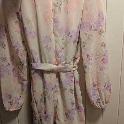 Nydelig kjole i en støvrosa/beige farge. Den har glidelås foran og noen små trykknapper inni. Lett stoff som legger seg fint på kroppen. Spiler som støtter opp rundt øvre del. Lappe er klippet vekk inni, så merket er ukjent.