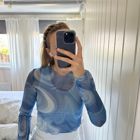 Nydelig topp fra Ganni litt gjennomsiktig bak.Litt liten i størrelsen . Materiale: 94% resirkulert nylon, 6% spandex.Pent brukt kun et par ganger.Nypris kr 1000, selges kr 350