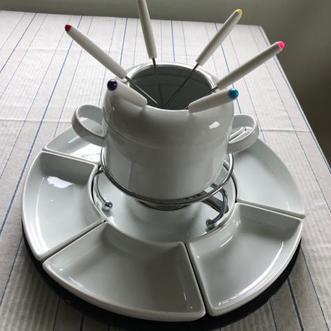 Fondue serveringssett for fire personer. Inneholder 1 høy skål, 1 varmeholder, 4 lave skåler og 4 gafler. Kjøpt på Kremmerhuset, helt ny ubrukt.