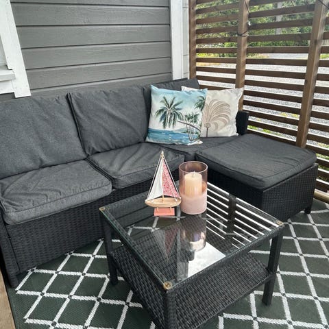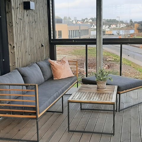 Pent brukt Jutlandia lounge hagemøbel. Loungsett med 4 deler og bord. 3 hjørnemoduler og 1 midtmodul. Slitesterke puter.