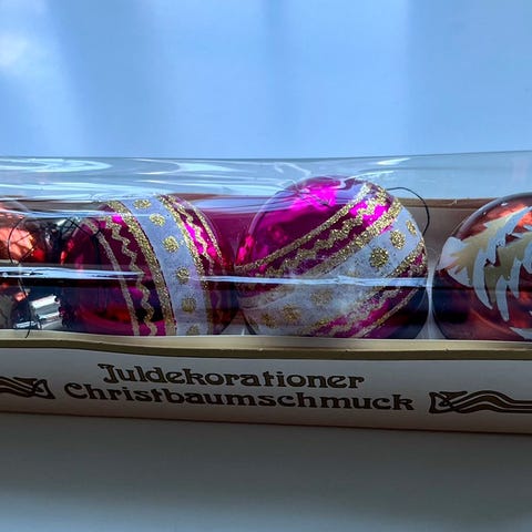 En eske med seks juletrekuler i glass. Alle er hele og fine. Kulene har vært brukt og har noen små spor etter det, men ikke noe som veldig synlig eller skjemmende. Ligger i original eske.