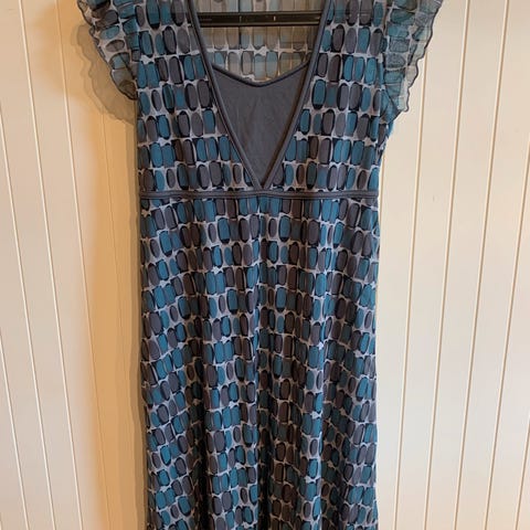 Pent brukt Riccovero kjole i syrenlilla farge/ mønster, A-formet med off white underkjole som er fastsydd. Kjolen er 84 cm fra skulder og ned. Selges da den ikke er i bruk. Kan hentes på Kleppestø / Askøy. Send PM