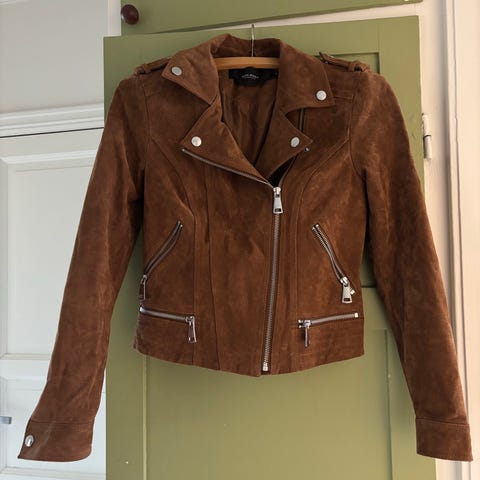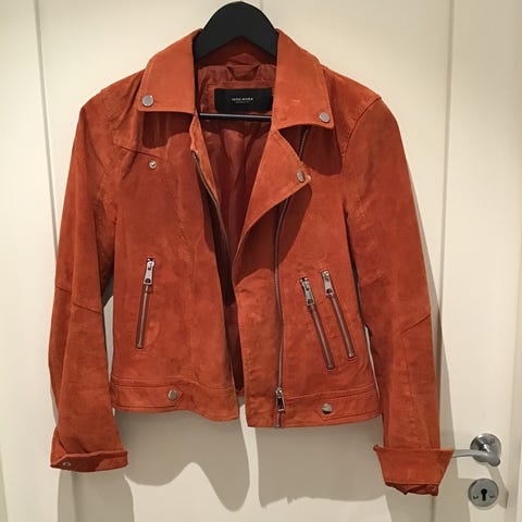Pent og lite brukt skinnjakke, semsket skinn, i str xs. Fargen er en mørk sennepsgul.