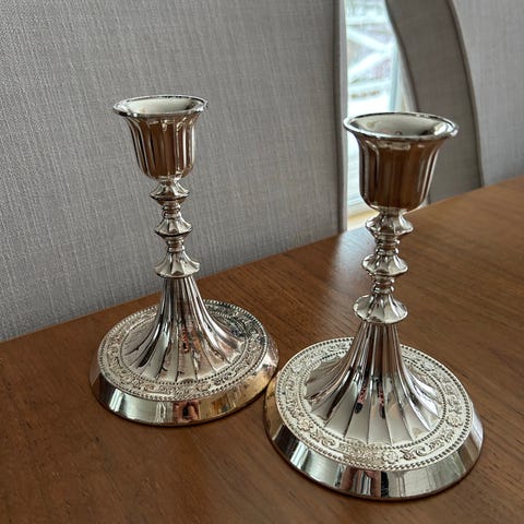 Lysestaker i sølvfarge. Flettet i "kurv materiale". Fra "Perfekt Home" tror jeg og de er sprayet sølv.