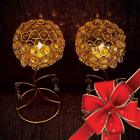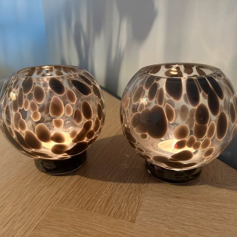 Selger et sett med to dekorative lysestaker i frostet glass med gullfarget innside og “Merry Christmas”-motiv. Gir et varmt og stemningsfullt lys når de er tent.