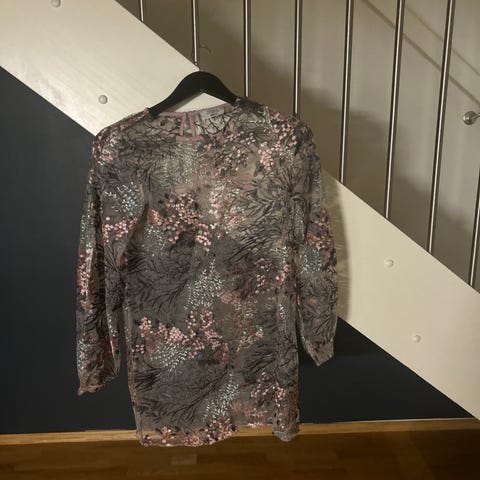 Pen kjøle fra Saint Tropes, str M, fôret, god stand. Grågrønn farge med sølv mønster, passer fint som festantrekk. Kommer fra røyk-og dyrefritt hjem.