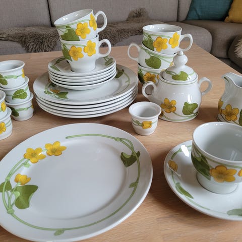 Serviset er i flott stand med blank og fin glasur uten krakelering. Noen av asjettene har noen få og knapt synlige bruksmerker og et par har et lite loppebitt og/eller merke i glasuren på undersiden.