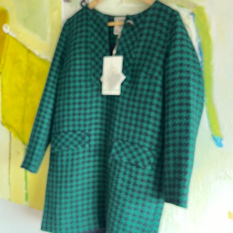 Tykt taftstoff, fòret. Stikklommer. Stor vidde i skjørt. Markert midje.