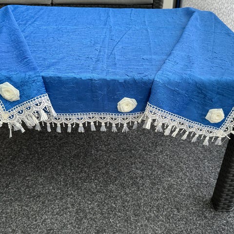 Tilnærmet ubrukte duker. Den lyse har disse målene: 89x99, den fargerike 89x89.