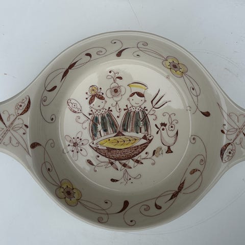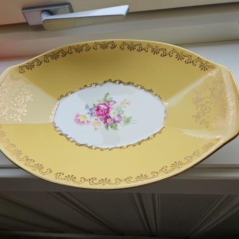 Pen serveringsbolle fra Stavangerflint Barokk med gul kant. HÞyde 9 cm. Dia 26*23 cm. Dybde ca 7 cm. Pent brukt. Kondisjon: Hel og pen uten skÄr, feil eller krakkelering. Gulldekor som nytt. God stand. Selger kr. 490,-. Pris er satt. Pakker godt viss sendes. Tar vipps. Sender + porto Norgespakke 140/PostNord 69.