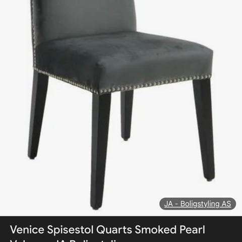 Selger 4 spisestoler i grå velour med kraftige metall ringer fra classic living. Stolene er laget av toppkvalitet. Stolene er gode og myke å sitte i. Ingen skader eller defekt.Stolene er vannavstøtende som også gjør det lett å holdes rent. Kan vaskes med en våt klut.