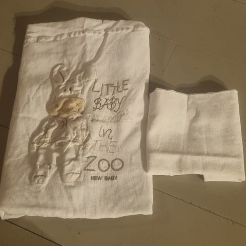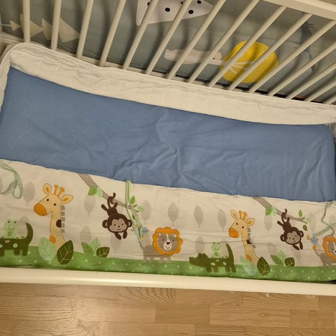 Hei har ein sengehimmel og halv sengekant og sengesett av tigergutt. Og et hvit laken til babyseng.