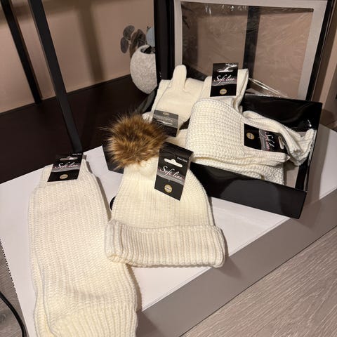 Settet inneholder lue, skjerf, hansker, sokker og benvarmere.