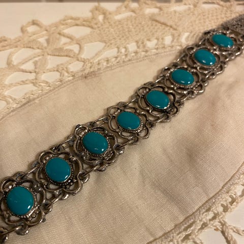 Nydelig vintage 50/60-talls armbånd - metall/uekte turkiser. Selges 360kr + evt frakt 69kr PostNord eller fiks ferdig. Tungt og solid.