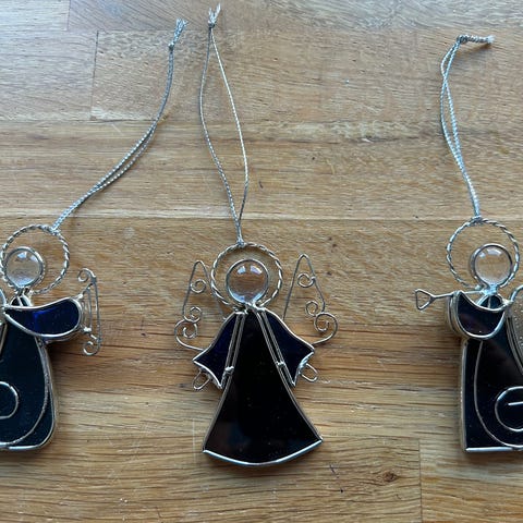 Den høyeste av de som står er 10 cm. De som henger er 9 cm høye. Kr 60.- .pr stk. Decsom står kr 80..- per stk.