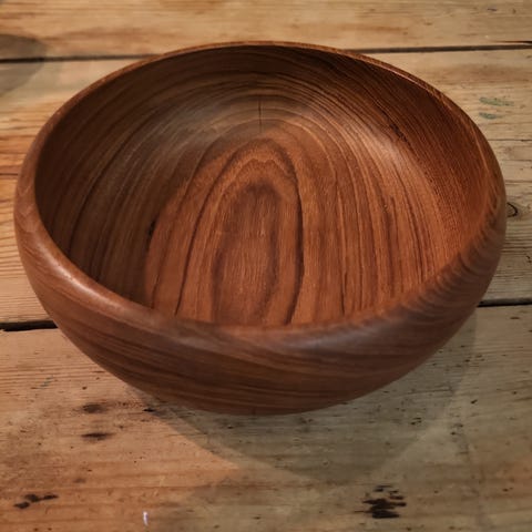 Bolle i heltre eik. Til f. eks. frukt. Behandlet med bivoks Diameter topp 19 cm. Fot 10 cm. Høyde 10,7 cm. Største diameter 23 cm. Vekt ca 510 gram. Kan sendes mot fraktkostnader.