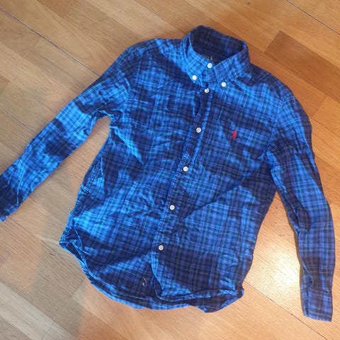 Rød og hvit stripete skjorte fra Ralph Lauren i str 6 år. Brukt et par ganger. Ser helt ny ut.
