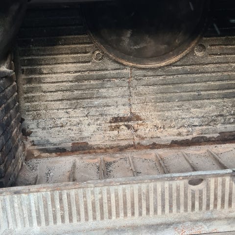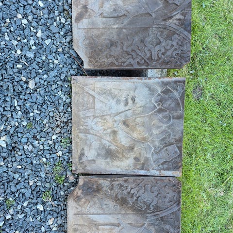 Har stått som bakplate i en peis noen år. Bidrar til god strålingsvarme og fungerer som et lite varmemagasin i peisen.